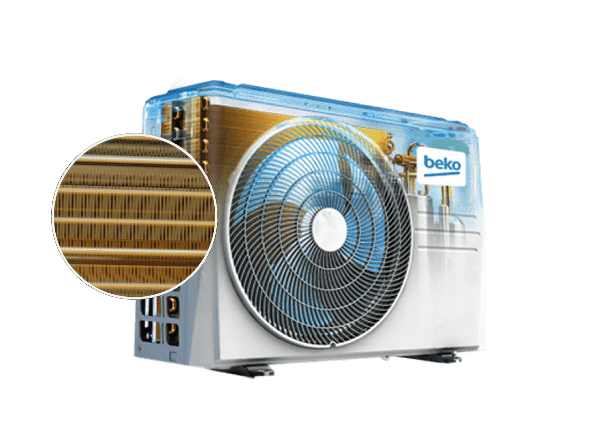 Unikátna povrchová ochrana pozlátením chráni vonkajšiu jednotku klimatizácie pred koróziou a vplyvmi počasia.