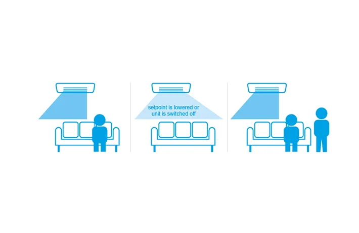 Užite si extra pohodlie s trojzónovým snímačom pohybu Inteligentné oko Ururu Sarara. Senzor odvádza vzduch od ľudí a automaticky prepne systém do režimu úspory energie, keď deteguje prázdnu miestnosť.