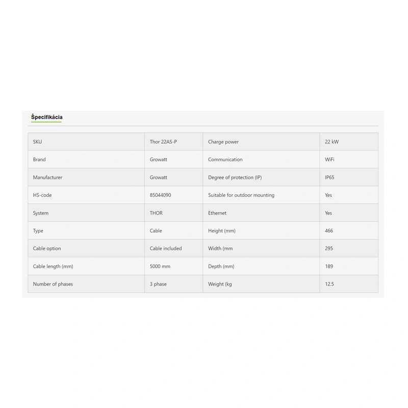 Growatt THOR 22AS-P-V1 je špičková trojfázová AC nabíjačka novej generácie, ktorá ponúka mimoriadne vysoký výkon až 22 kW. Je navrhnutá pre náročných používateľov, ktorí požadujú rýchle nabíjanie, maximálnu spoľahlivosť a inteligentné riadenie energie. Vďaka pokročilej komunikácii s fotovoltikou, robustnej konštrukcii a smart ovládaniu patrí medzi najlepšie riešenia pre domy, firmy, komerčné objekty aj bytové domy.