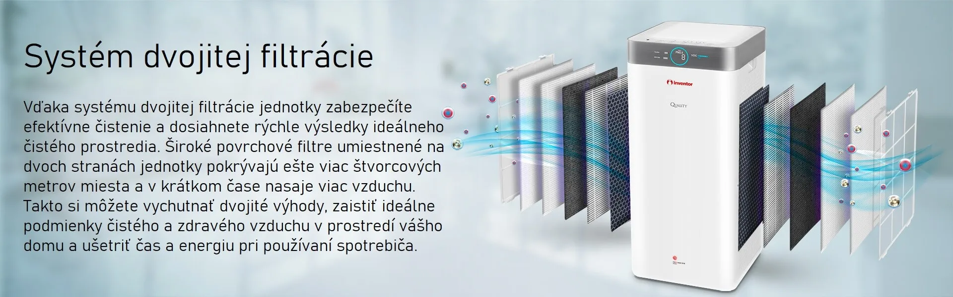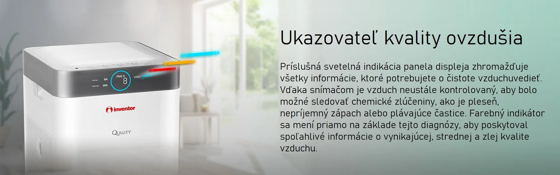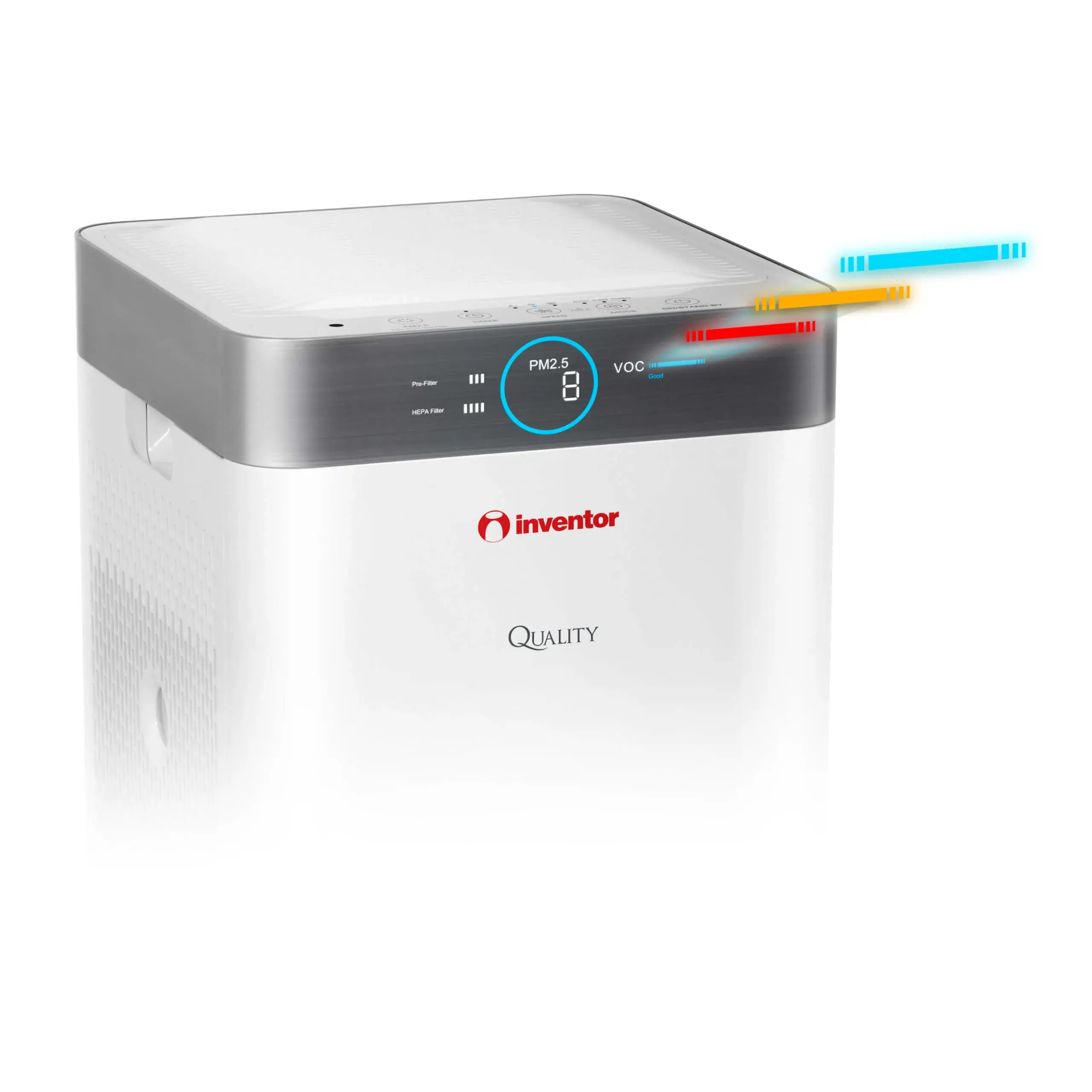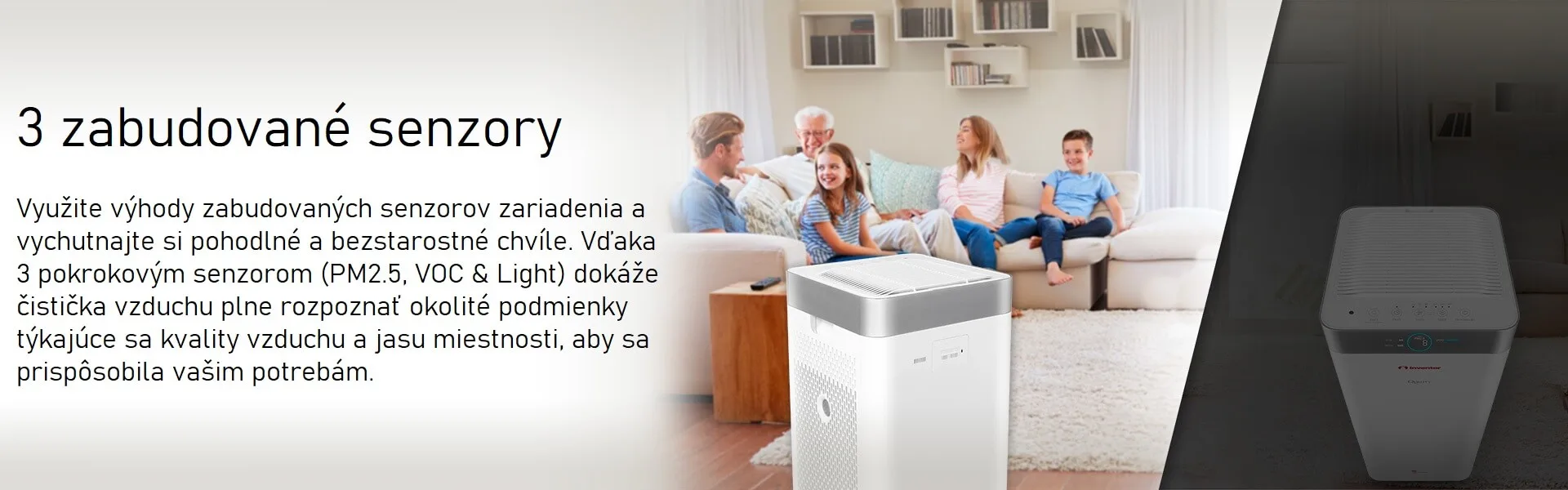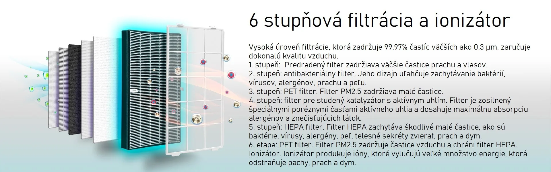 Čistička vzduchu so 6 – stupňovou filtráciou a systémom dvojitej filtrácie. Má 3 zabudované senzory, ukazovateľ kvality ovzdušia a automatickú funkciu.
