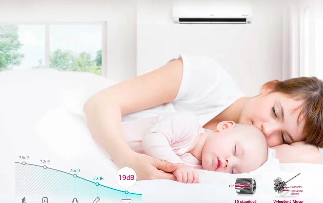 LG klimatizačné jednotky pracujú v nízkych hlukových hladinách, vďaka LG unikátnemu šikmému ventilátoru a BLDC motoru – technológiám, ktoré eliminujú nežiadúci hluk a umožnia tak plynulejší chod jednotky.