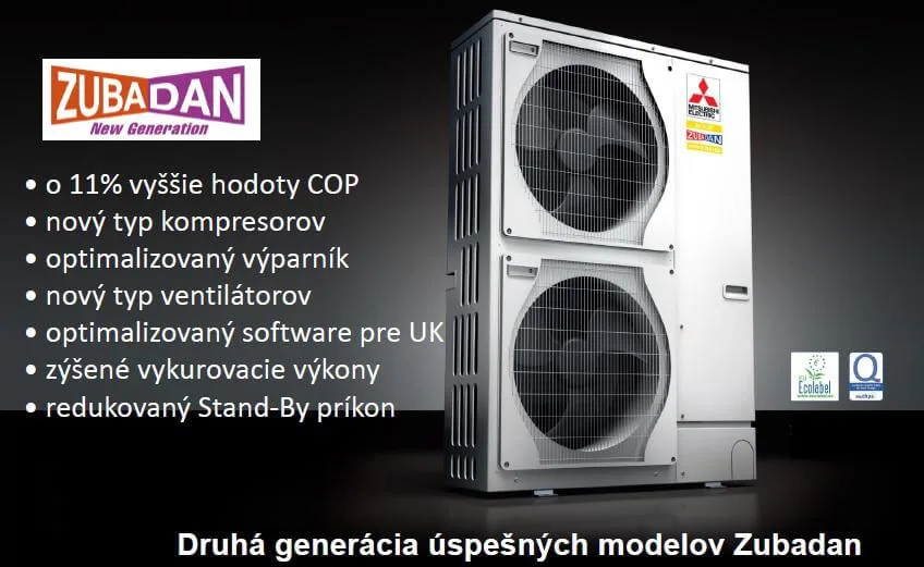 Nové tepelné čerpadlá z rady ZUBADAN INVERTER – NEW GENERATION od Mitsubishi eletric ponúka energeticky úspornejšiu prevádzku. Produkty dosahujú energetické triedy A+/A++. Vykurovací faktor (COP) dosahuje hodnoty až 4,7. Tieto tepelné čerpadlá sú ideálnym riešením pre nízkoenergetické rodinné domy.
