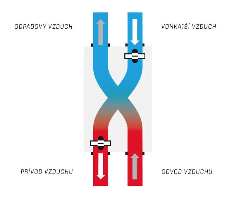 • Jednotka zároveň nasáva čerstvý vonkajší vzduch, ktorý filtrom vyčistí, v krížovo-protiprúdovom doskovom výmenníku tepla ho zohreje a privádza do príslušných miestností, napr. do obývačky, spálne a detskej izby.
