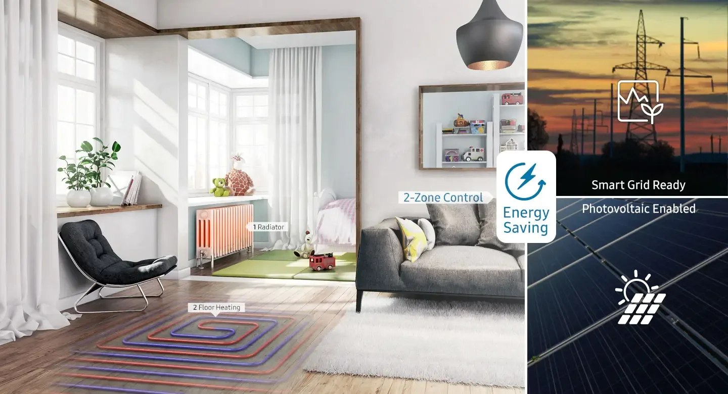 Tepelné čerpadlo šetrí energiu pokročilými funkciami. Dvojzónová regulácia optimalizuje teplotu v dvoch samostatných zónach. Funkcia Príprava pre fotovoltiku (Photovoltaic Enabled) ovláda stav solárnych panelov a znižuje spotrebu elektrickej energie v sieti. A funkcia Príprava pre inteligentnú sieť (Smart Grid Ready) vám pomôže využívať úsporné a udržateľné možnosti napájania.