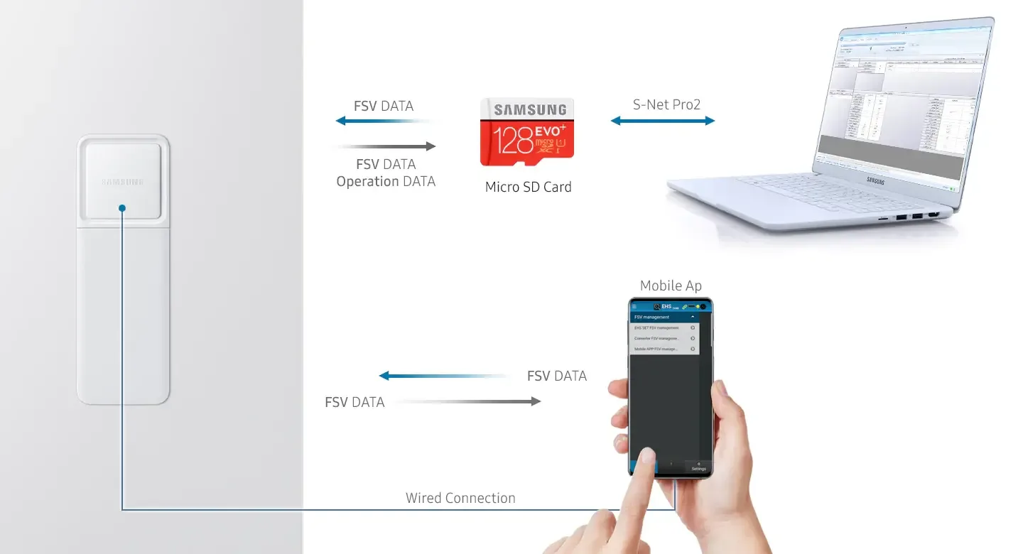 Jednoduchšie nastavenie a údržba vášho Samsung EHS – šetrí váš čas a námahu. Intuitívne servisné možnosti redukujú prácnosť uvádzania do prevádzky a údržby použitím konvertora PBA*, karty Micro SD** alebo mobilnej aplikácie Samsung S-Checker.***
