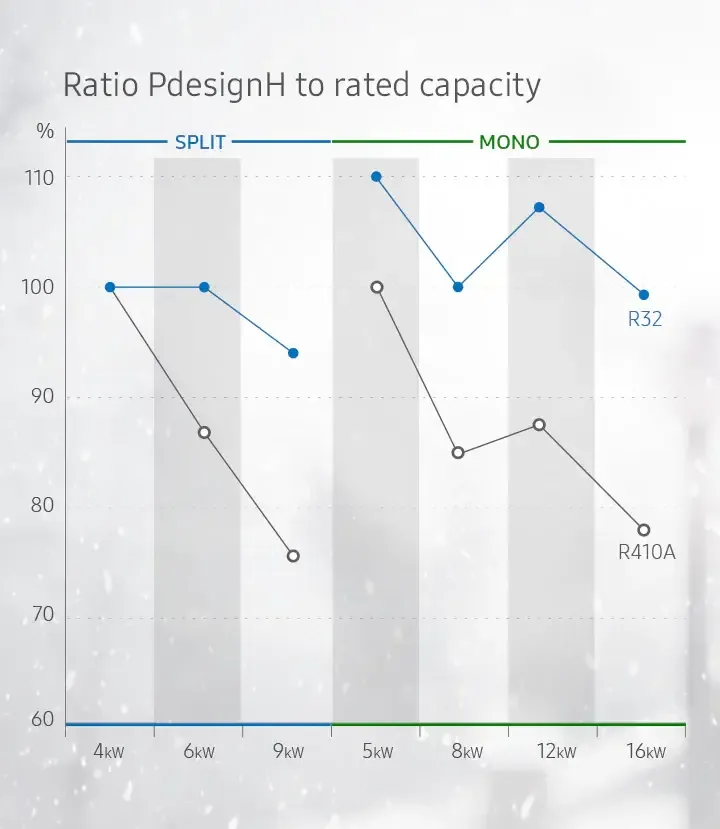 Oveľa menšie obavy z nákladov na vykurovanie. Má špičkovú energetickú triedu SCOP A+++ v celom rozsahu kapacít*. Dokazuje tak, že vďaka použitiu chladiva R32 s vysokým projektovaným vykurovacím zaťažením PdesignH (kW)** pracuje s vysokou účinnosťou a výbornými vykurovacími ukazovateľmi.