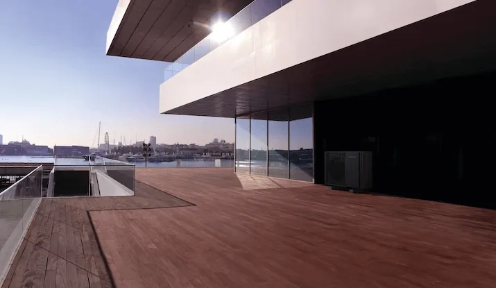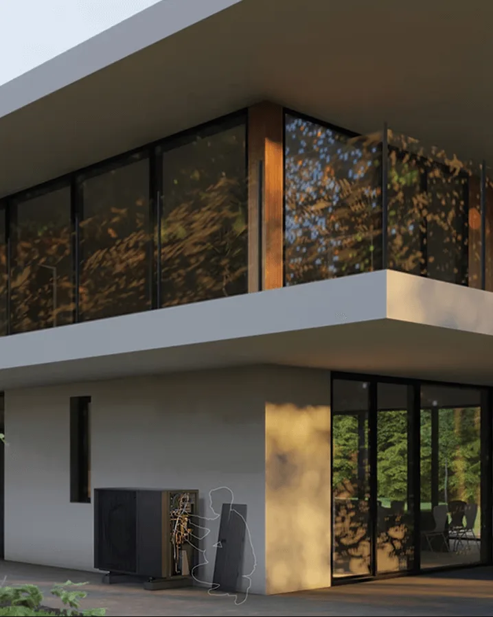 Tepelné čerpadlo EHS Split nerušene zapadne na vonkajšiu stranu akejkoľvek budovy. Dodáva sa v tmavosivej farbe, ktorá dopĺňa aktuálne architektonické trendy pre fasády moderných budov. Vonkajšia jednotka s výškou približne 1 meter obsahuje novú vodorovnú čiernu mriežku, vďaka ktorej nevidno vnútornú mechaniku.