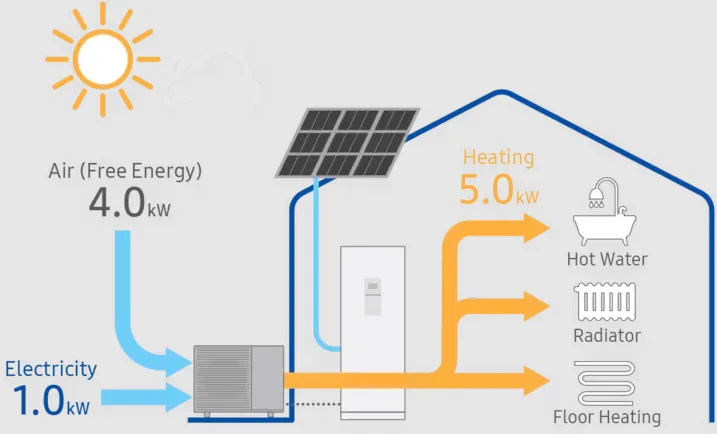 EHS Split je systém tepelného čerpadla, ktorý poskytuje energeticky účinné vykurovanie (SCOP* A+++)² a teplú vodu pre domácnosť. Na výrobu 5,0 kW energie spotrebuje približne len 1 kW elektrickej energie a zvyšok získava zo vzduchu³.