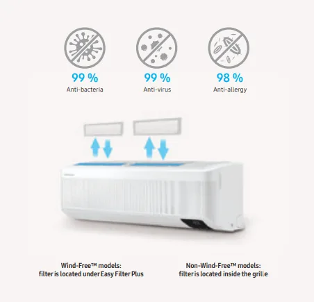 Easy Filter sa nachádza na vrchnej časti klimatizácie. Filter sa jednoducho vyberá, čistí a vkladá späť do klimatizácie. Filtruje vzdušné nečistoty a alergény. Klimatizačná jednotka Samsung má vynikajúcu filtračnú sieť, ktorá udržuje čerstvý vzduch a čistú jednotku. Prekrýva 100% vstupného otvoru pre vzduch a jeho povrch je tvorený jedinečným antibakteriálnym a antivírusovým materiálom.